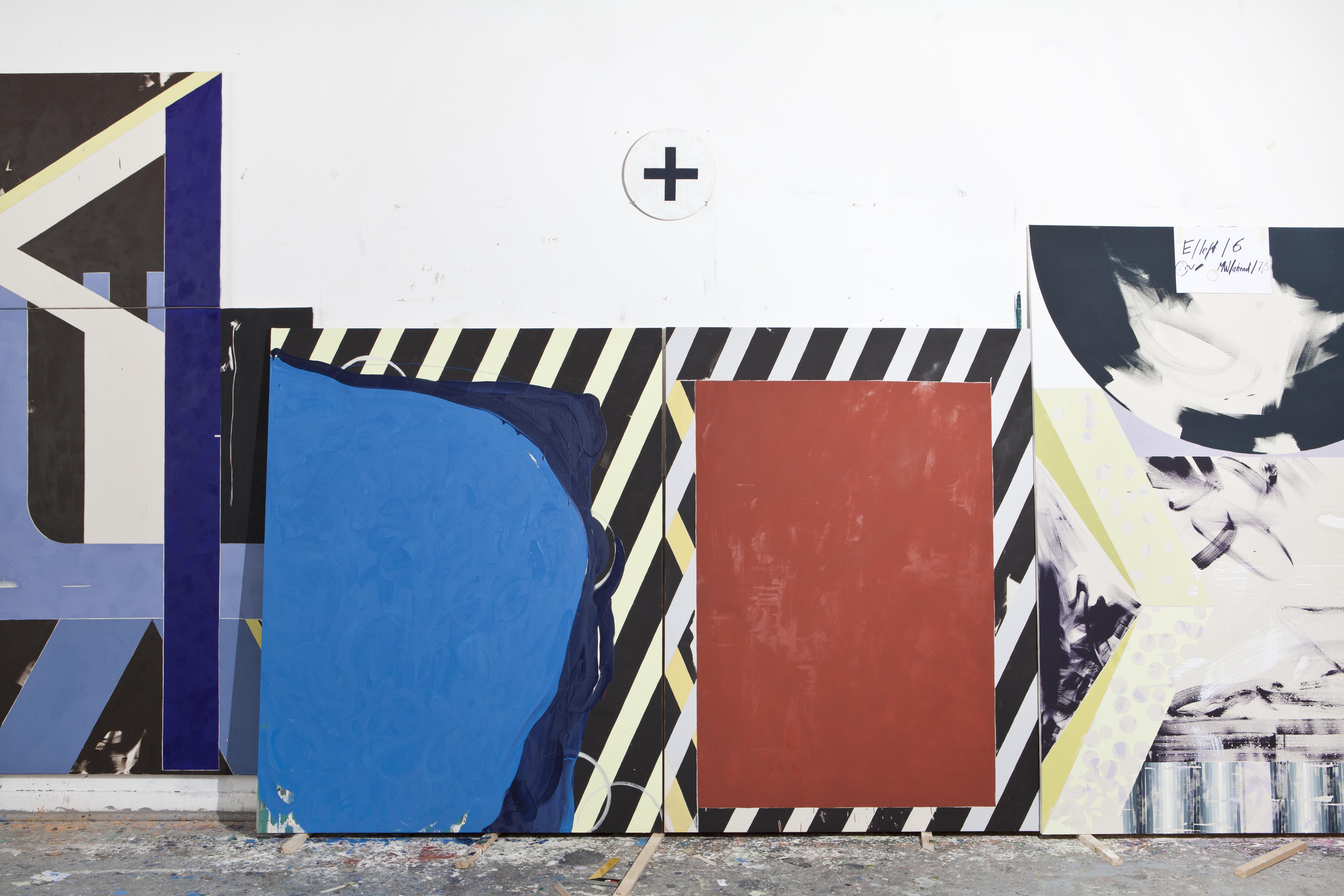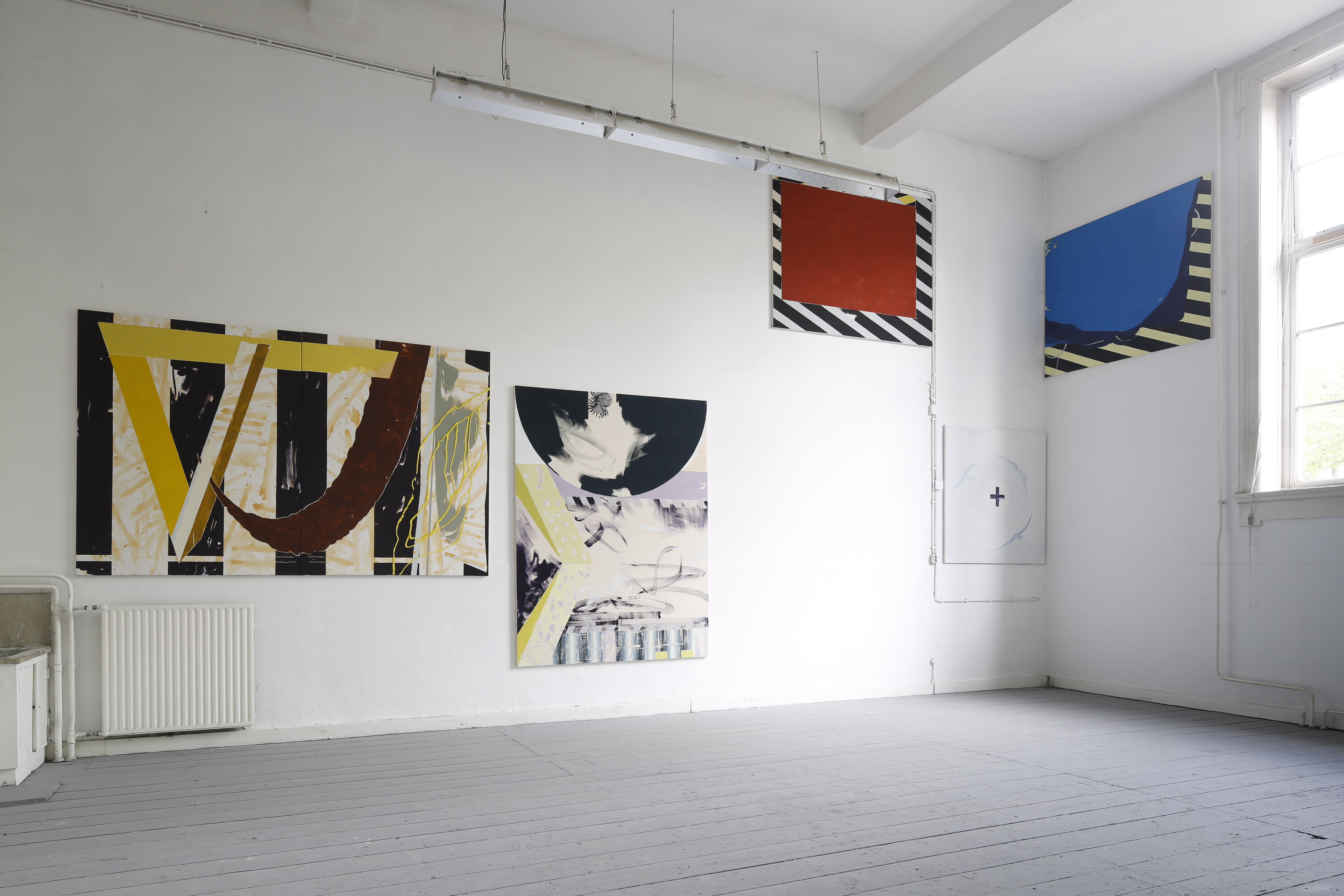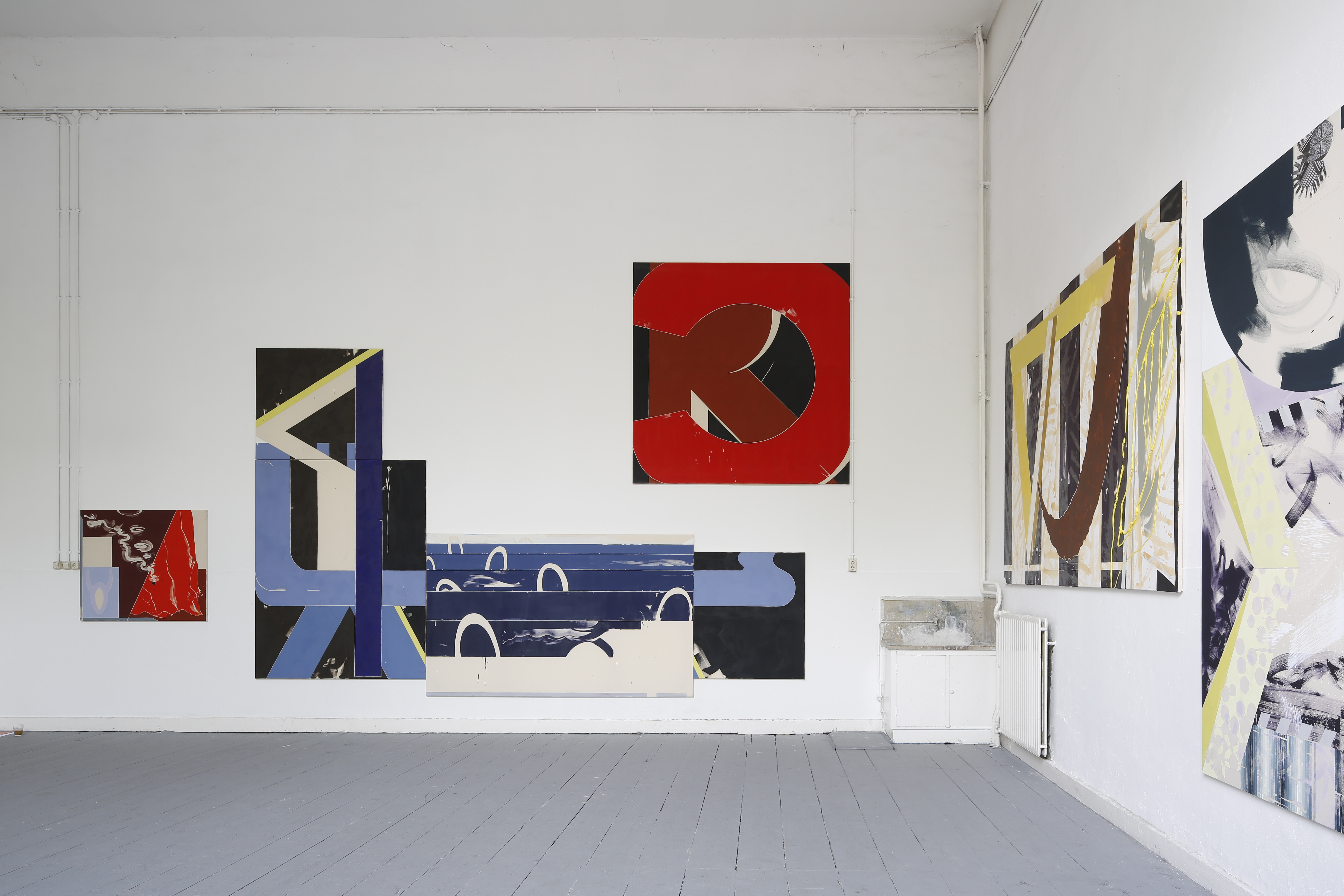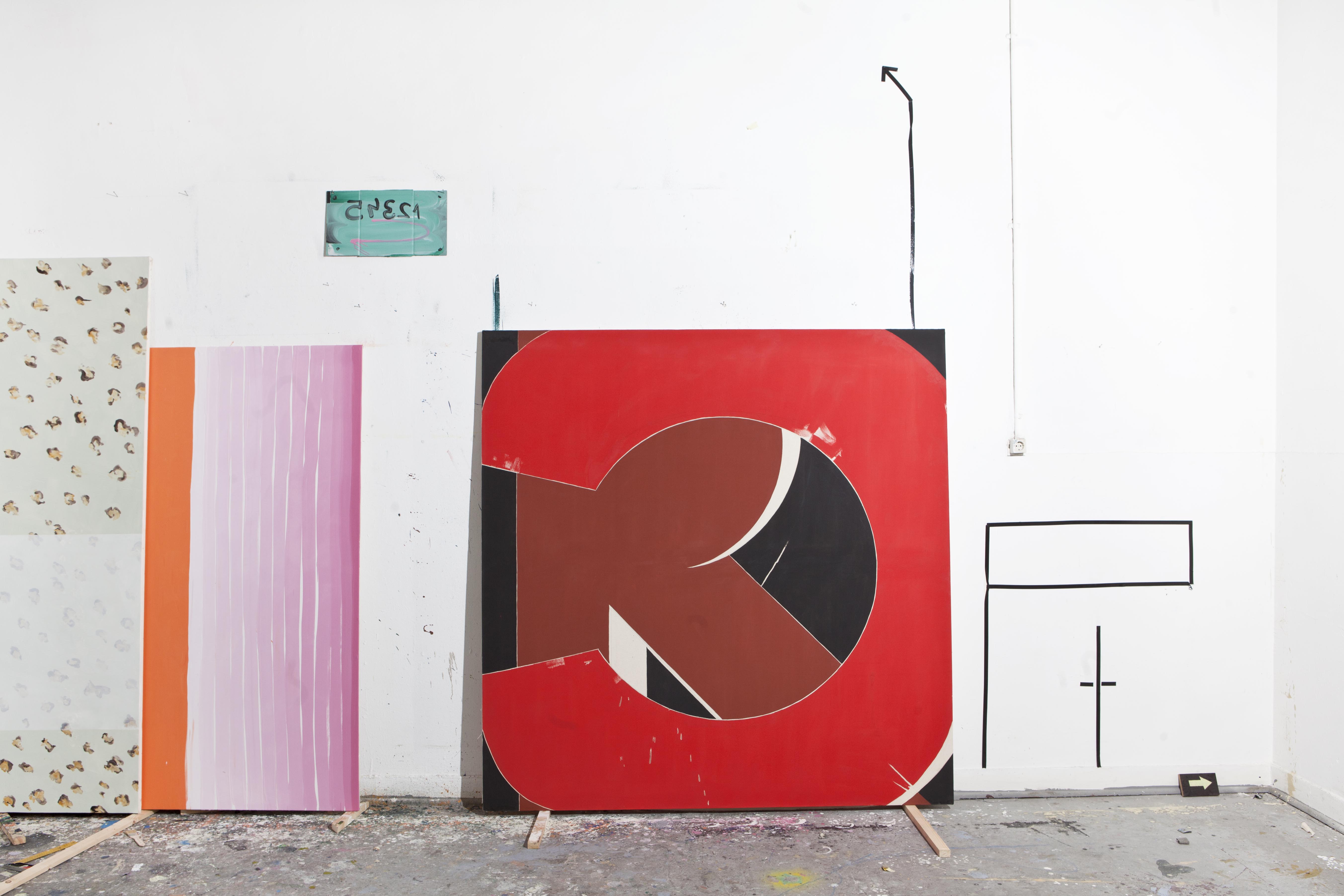 Recurring elements in Von Zimmermann’s paintings are small sign-like motifs that are staking out a territory somehwere between Matt Mullican and medieval heraldry. There are large scale, sharp-edged, cool Pop-like paintings of letters: a large one depicts an `R´overlaid with a `C, the letters cropped by the edges of the frame, as if to suggest an expansive nature, a longing for connections to the world outside of the canvas. Other paintings show more gestural abstract forms, although they rarely are the result of free, unfiltered expression or impulse. Even these looser compositions are considered constrcutions, a product of relational intentions: meant to be part of a preconceived grander sheme. In this sense, Von Zimmermann’s paintings can be understood on relation to the Gesamtkunstwerk-aspect of opera or theater. She `performs´her paintings as fragments to become whole in a coherently and precisely designed scenography, creating a hybrid space of autonomous painting and theatrical decor in which the spectator finds his/her gaze returned in a state of heightened self-awareness.